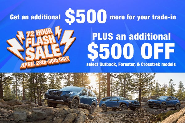 *Offer valid April 28–30. Additional $500 trade-in bonus requires eligible trade-in vehicle and is applied toward the purchase of a new Subaru. Additional $500 off available on select new Subaru Outback, Forester, and Crosstrek models only. One offer per vehicle. Not all buyers will qualify. Must take retail delivery by April 30. If provided, Advertised Price EXCLUDES all optional dealer offered items, accessories, or product addendums optionally selected by the purchaser, and official government charges, taxes and fees. Further, dealership charges a $699 SC Dealer Closing Fee as regulated by SC state and federal law, included in Advertised Price. See dealer for complete details.