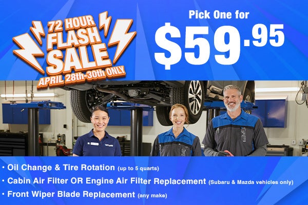 ^Plus tax and applicable fees. Oil change includes up to 5 quarts. Cabin and engine air filter offer valid on Subaru and Mazda vehicles only. Front wiper blade replacement available on most makes and models. May not be combined with any other offer. Must present offer at time of write-up. See dealer for details. Offer valid April 28–30.