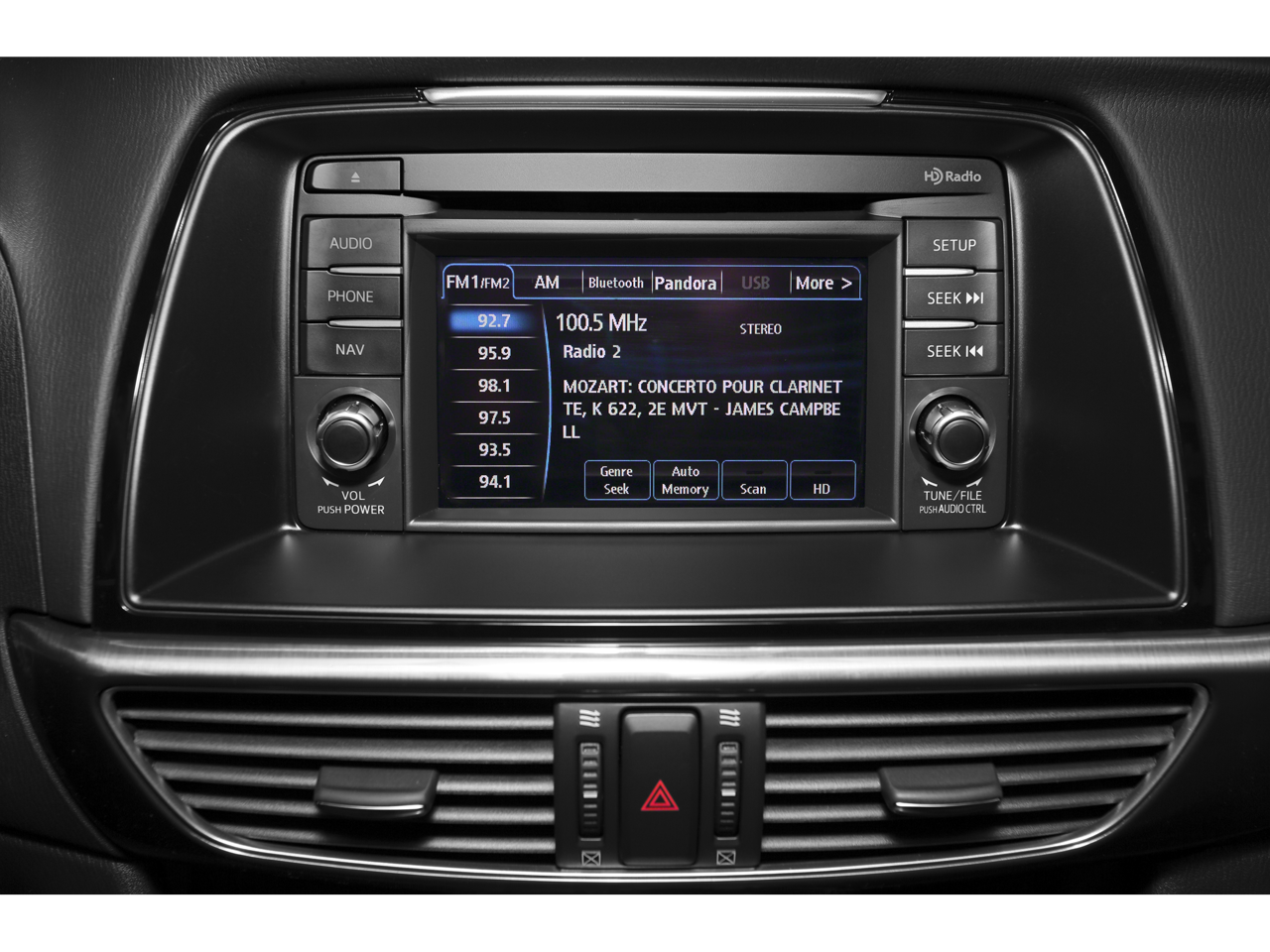 - Radio: AM/FM/CD/MP3/AUX 6-Speaker Audio & HD Radio -inc: 4-full range door speakers and 2-tweeters, audio menu voice-command, Bluetooth® hands free phone and audio, E911 automatic emergency notification, 5.8" full-color touch-screen display for audio, phone, rearview camera, Pandora internet radio compatibility, Radio Broadcast Data System program information, SMS text message audio delivery and reply and USB audio input