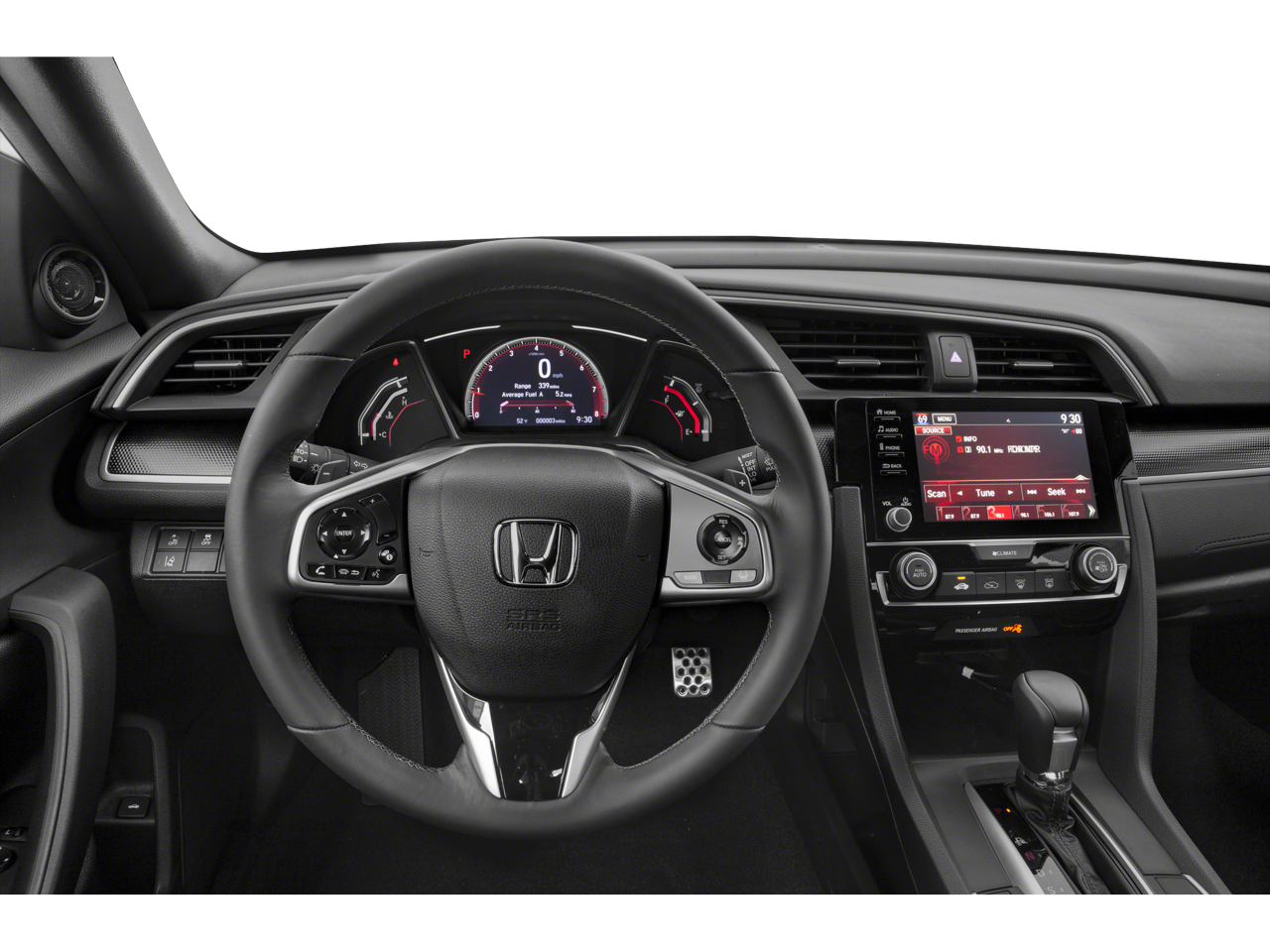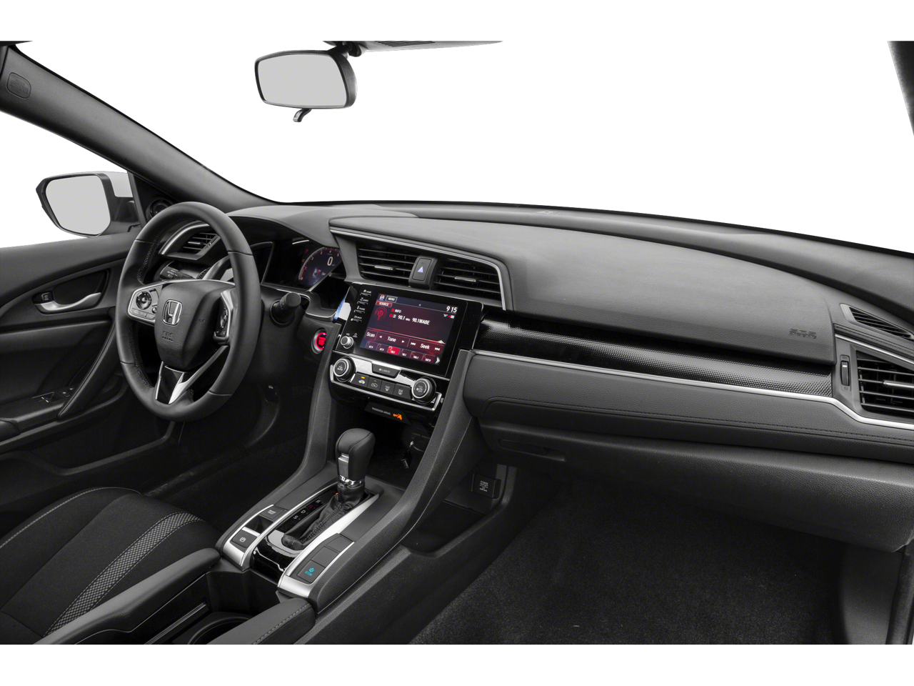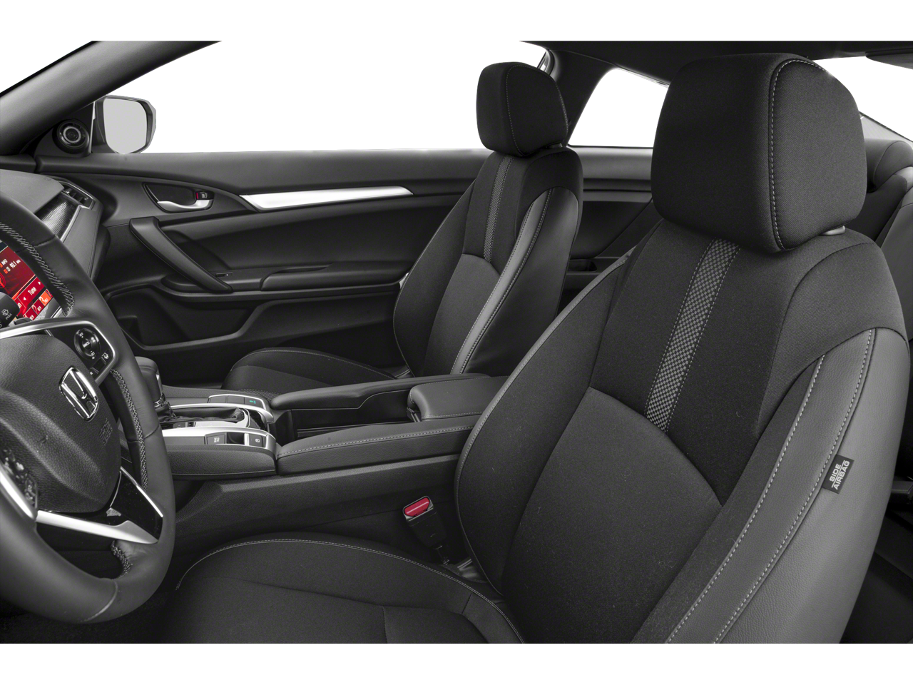 Black w/Cloth Seat Trim, 4-Wheel Disc Brakes, 8 Speakers, ABS brakes, Adaptive Cruise Control: Adaptive Cruise Control (ACC) with Low-Speed Follow, Air Conditioning, Alloy wheels, AM/FM radio, Apple CarPlay/Android Auto, Auto High-beam Headlights, Automatic temperature control, Brake assist, Bumpers: body-color, Cloth Seat Trim, Delay-off headlights, Driver door bin, Driver vanity mirror, Dual front impact airbags, Dual front side impact airbags, Electronic Stability Control, Emergency communication system: HondaLink, Exterior Parking Camera Rear, Forward collision: Collision Mitigation Braking System (CMBS) + FCW mitigation, Four wheel independent suspension, Front anti-roll bar, Front Bucket Seats, Front Center Armrest, Front fog lights, Front reading lights, Fully automatic headlights, Illuminated entry, Lane departure: Lane Keeping Assist System (LKAS) active, Leather Shift Knob, Low tire pressure warning, Occupant sensing airbag, Outside temperature display, Overhead airbag, Panic alarm, Passenger door bin, Passenger vanity mirror, Power door mirrors, Power steering, Power windows, Radio data system, Radio: 180-Watt AM/FM Audio System, Rear anti-roll bar, Rear window defroster, Remote keyless entry, Security system, Speed control, Speed-sensing steering, Split folding rear seat, Steering wheel mounted audio controls, Tachometer, Telescoping steering wheel, Tilt steering wheel, Traction control, Trip computer, and Wheels: 18 Alloy w/Gloss Black Inserts.