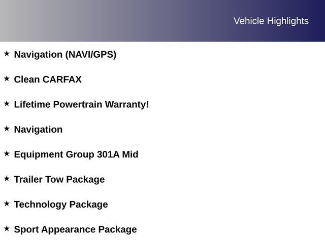 Navigation (NAVI/GPS), Clean CARFAX, Lifetime Powertrain Warranty!, 4WD, 110V AC Power Outlet, Adaptive Cruise Control, Auto-Dimming Rear-View Mirror, Class IV Trailer Hitch Receiver, Equipment Group 301A Mid, Forward Sensing System, Leather-Wrapped Shifter, Leather-Wrapped Steering Wheel, Navigation, Reverse Sensing System, Sport Appearance Package, Technology Package, Trailer Tow Package.