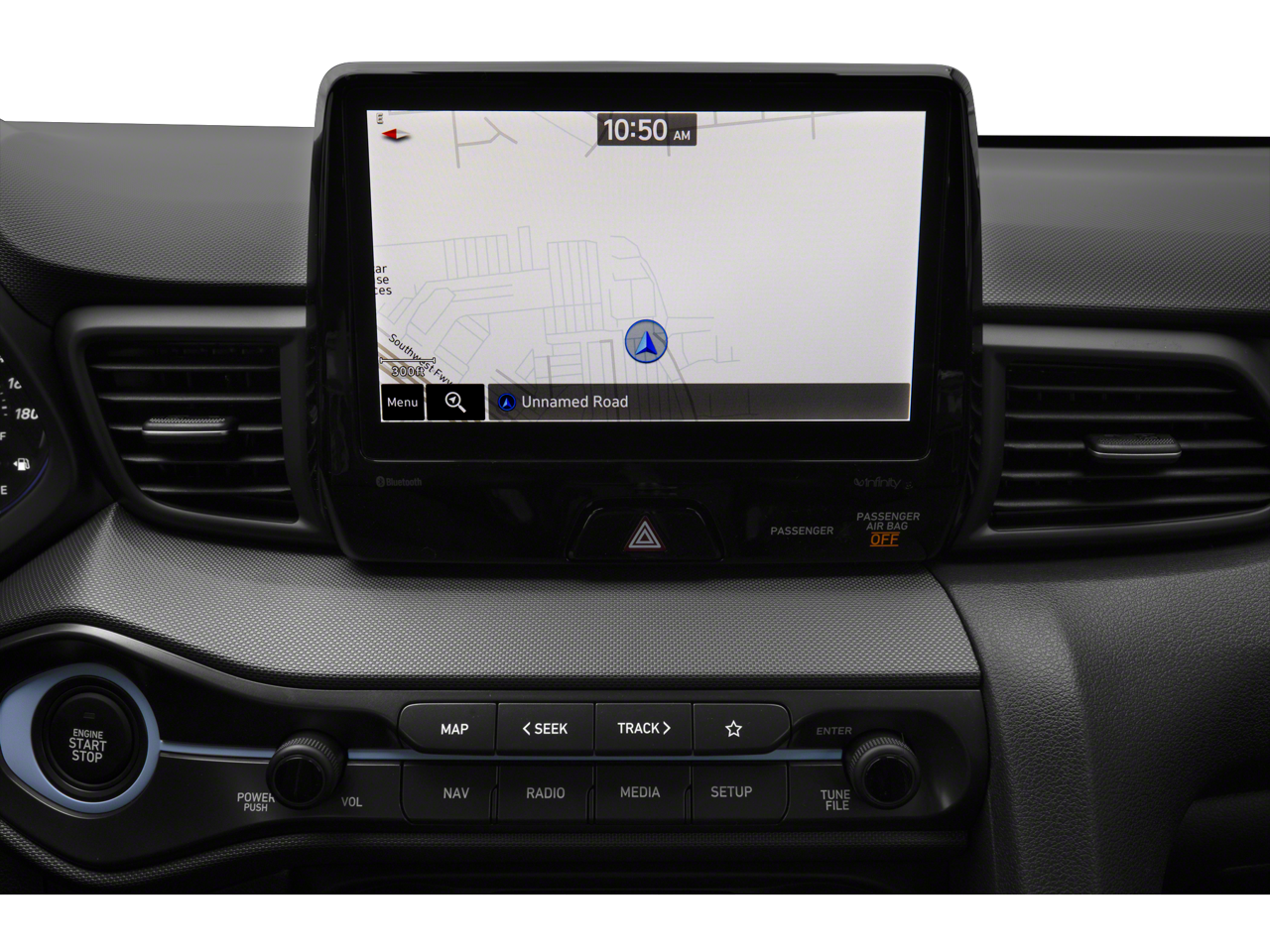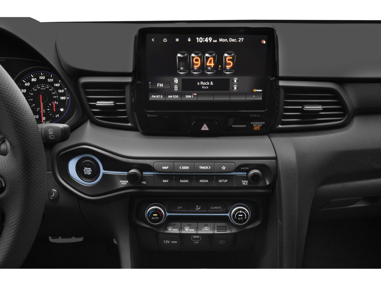 - Radio: AM/FM/HD/SiriusXM Infinity Premium Audio -inc: 8" display navigation 5.0, N specific menus, 8 speakers including subwoofer w/external amp, Bluetooth® hands-free phone system w/voice recognition, Apple CarPlay and Android Auto, active sound design (ESG), smartphone/MP3 auxiliary input jacks, dual charging USB ports, speed-sensitive automatic volume contro and Blue Link (Gen 2) connected car system