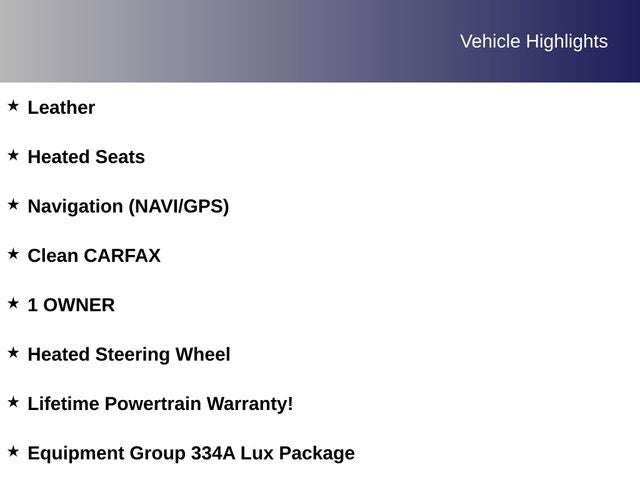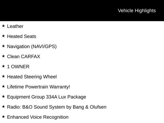 Leather, Heated Seats, Navigation (NAVI/GPS), Clean CARFAX, 1 OWNER, Heated Steering Wheel, Lifetime Powertrain Warranty!, 12 LCD Capacitive Touchscreen w/Swipe Capability, 2 Smart Charging USB Ports In Dashboard, 2-Door Intelligent Access w/Lock/Unlock, 360-Degree Camera, Adaptive Cruise Control, Additional Sound Deadening, Ambient Footwell Lighting, Auto-Dimming Interior Rear-View Mirror, Connected Built-In Navigation, Dr & Pass Illuminated Sliding Visor Vanity Mirrors, Dual-Zone Electronic Automatic Temperature Control, Enhanced Voice Recognition, Equipment Group 334A Lux Package, Evasive Steering Assist, Front Parking Sensors, Front Row Heated Seats, Heated Steering Wheel, Information on Demand Panel, Power Outlet - Back Side of Center Floor Console, Radio: B&O Sound System by Bang & Olufsen, Rear Parking Sensors, Sideview Mirrors, Universal Garage Door Opener, Wireless Charging Pad.