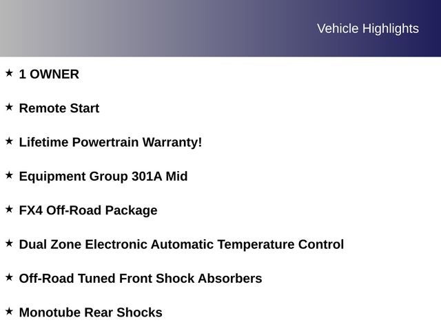 1 OWNER, Remote Start, Lifetime Powertrain Warranty!, 4WD, 4x4 FX4 Off-Road Bodyside Decal, 8-Way Power Driver's Seat w/Power Lumbar, 8 Productivity Screen in Instrument Cluster, Auto-Dimming Rear-View Mirror, Class IV Trailer Hitch Receiver, Dual Zone Electronic Automatic Temperature Control, Equipment Group 301A Mid, FX4 Off-Road Package, Hill Descent Control, Leather-Wrapped Steering Wheel, Monotube Rear Shocks, Off-Road Tuned Front Shock Absorbers, Rear Under-Seat Storage, Rock Crawl Mode, SecuriCode Drivers Side Keyless-Entry Keypad, SYNC 4 w/Enhanced Voice Recognition, Tray Style Floor Liner (47W)..