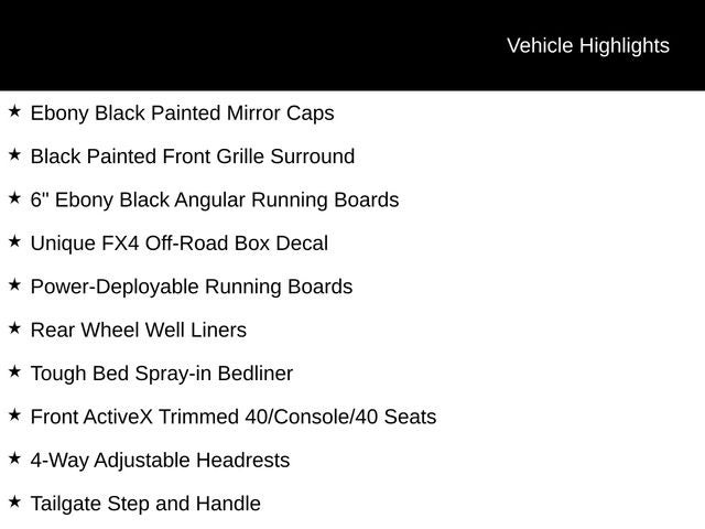 4WD, 3.73 Axle Ratio, 4-Way Adjustable Headrests, 6 Ebony Black Angular Running Boards, Black Appearance Package, Black Painted Front Grille Surround, Body Color Front and Rear Bumpers, Ebony Black Painted Mirror Caps, Front ActiveX Trimmed 40/Console/40 Seats, FX4 Off-Road Package, Head-Up Display, Hill Descent Control, Lariat Ultimate Package, Off-Road Specifically Tuned Shock Absorbers, Order Code 618A, Power-Deployable Running Boards, Power-Sliding Rear-Window with Defrost, Pro Trailer Backup Assist, Pro Trailer Hitch Assist, Radio: B&O Sound System by Bang and Olufsen, Radio: B&O Unleashed Sound System by Bang & Olufsen, Rear Wheel Well Liners, Tailgate Step and Handle, Tough Bed Spray-in Bedliner, Unique FX4 Off-Road Box Decal, Wheels: 18 Bright Machined and Carbonized Gray Aluminum, Wheels: 20 Machined and Ebony Black High Gloss.